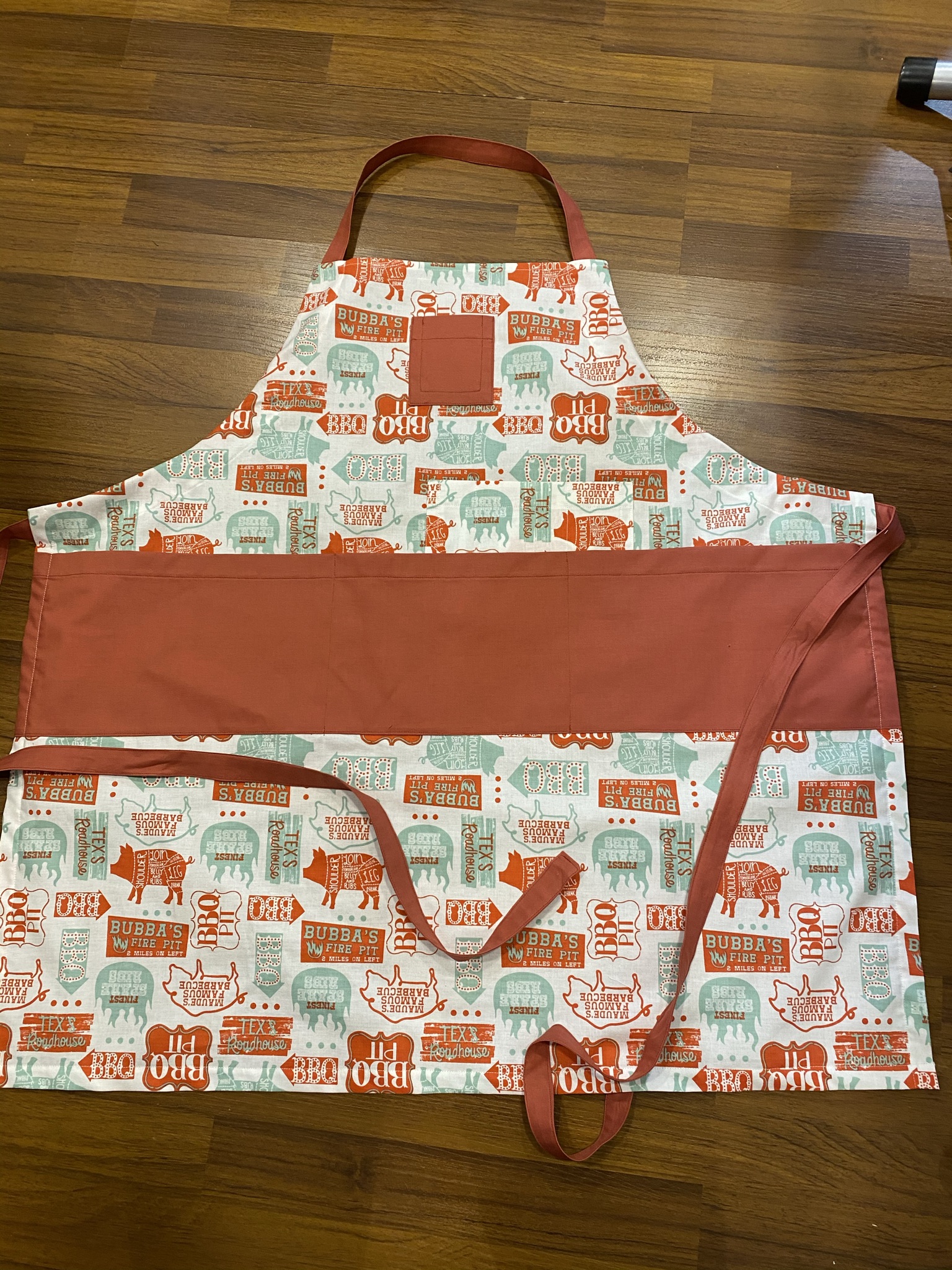 Perfect for the BBQ chef. This apron has three pockets. The neck piece and ties are one long piece so no need for ties around the neck. It’s made in a larger size.